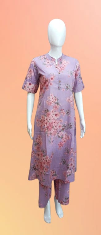 Floral Lavender Cotton Kurti with Straight Pant Set