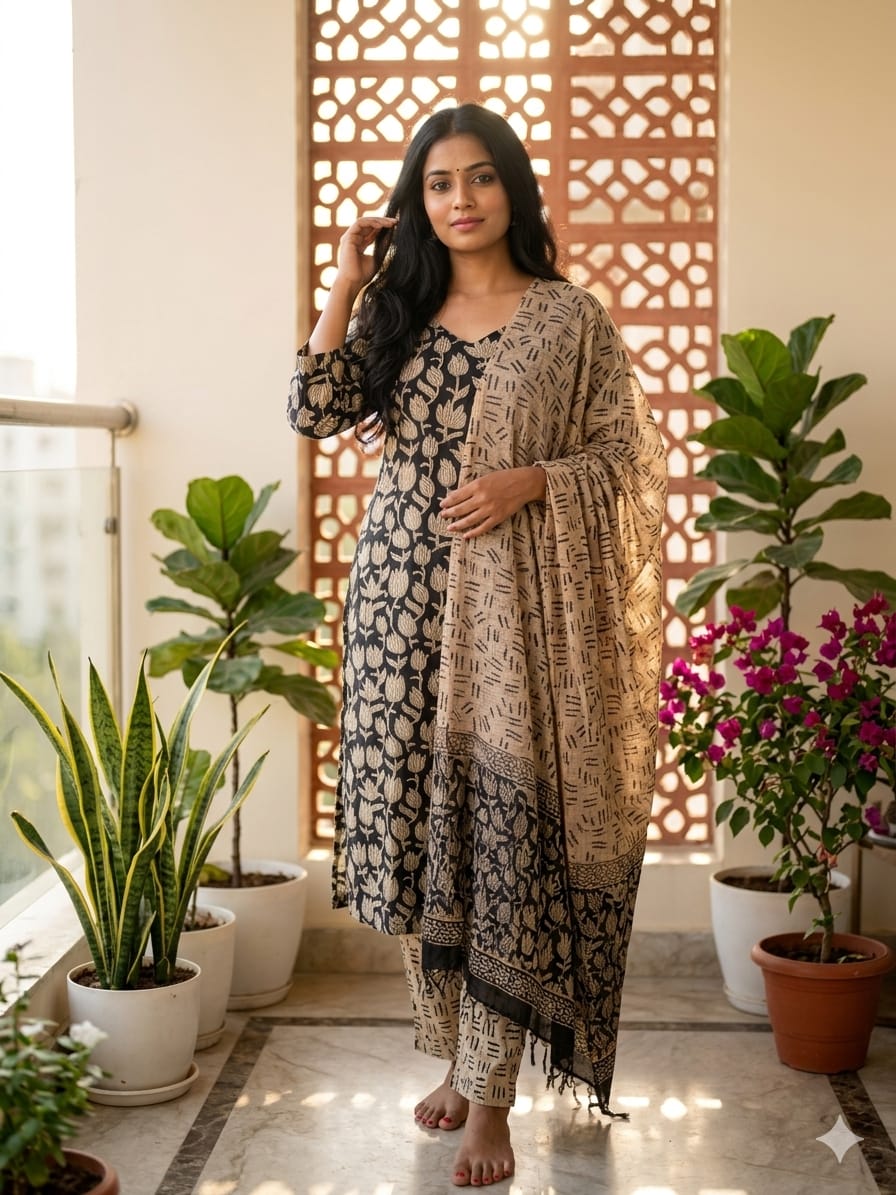 This sophisticated black and beige kurta set features intricate ethnic prints paired with a matching dupatta. Designed for effortless elegance, it is perfect for festive occasions, family gatherings, and cultural events. The detailed patterns create a rich and traditional appeal.