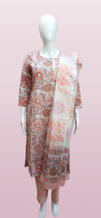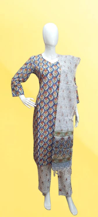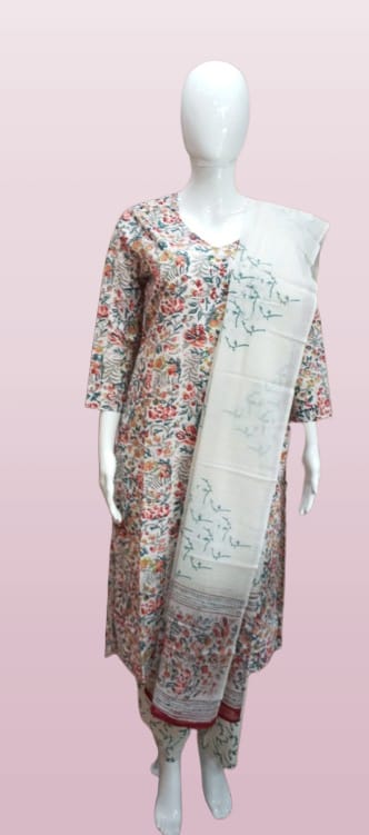 Timeless and classy, this black kurta set showcases ethnic white motifs paired with matching printed pants and a coordinating dupatta. Whether it’s workwear, casual dinners, or festive styling — this suit delivers sophistication with comfort.