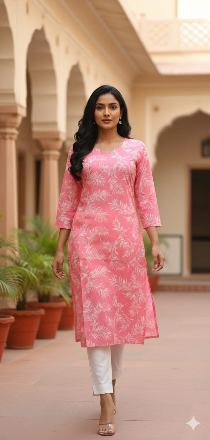 Add a soft feminine charm to your wardrobe with this pink floral printed kurta. The delicate floral motifs and soothing color make it perfect for daytime events, brunches, or festive gatherings. The comfortable straight fit and classic neckline ensure effortless elegance.